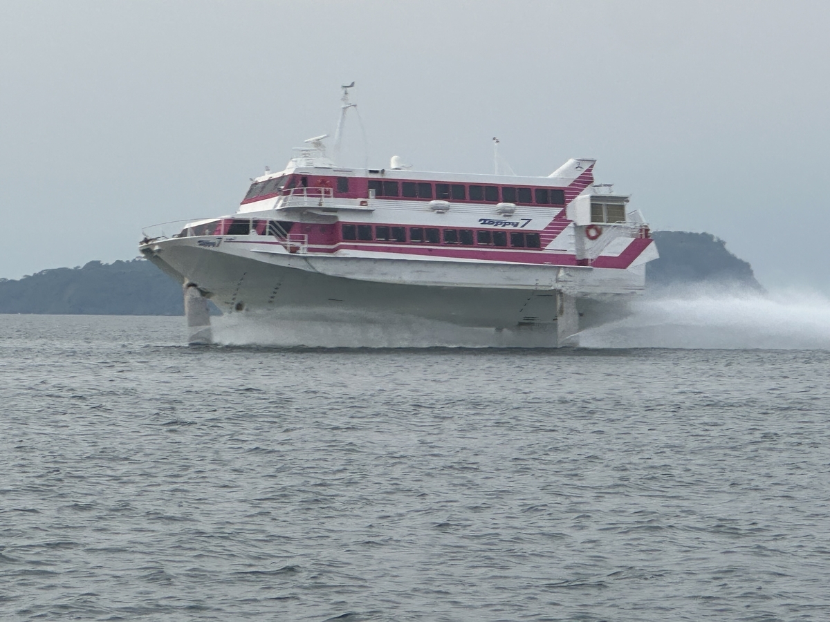 錦江湾の湾口まで来た頃、遠くからすっ飛んでくる船を発見🛥️
